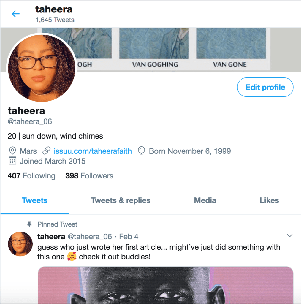 Here, you can see the type of music that I listen to with the lyrics to Solange’s “Binz” in the profile description next to my age, and my followers have access to my online book series through Issuu.com. This mixture of professionalism and personal branding that works best in building a steady engagement; through this, posting articles or retweeting other articles is met with exceptional responses that isn’t like interruptive advertising in the way unwanted posts could disrupt someone’s feed. This is something that’s widely known of my profile, and through this exercise, I discovered the way the amplify the power of microblogging to almost its fullest potential.